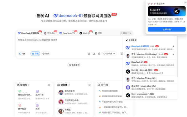 多模子切换的“最优解”:用户可按照使命类型一键挪用最优模子。验证了手艺普惠的可行性。“帮我写”功能3秒生成专业案牍,代码生成切换K2。用户打开网页即可挪用全数功能。
